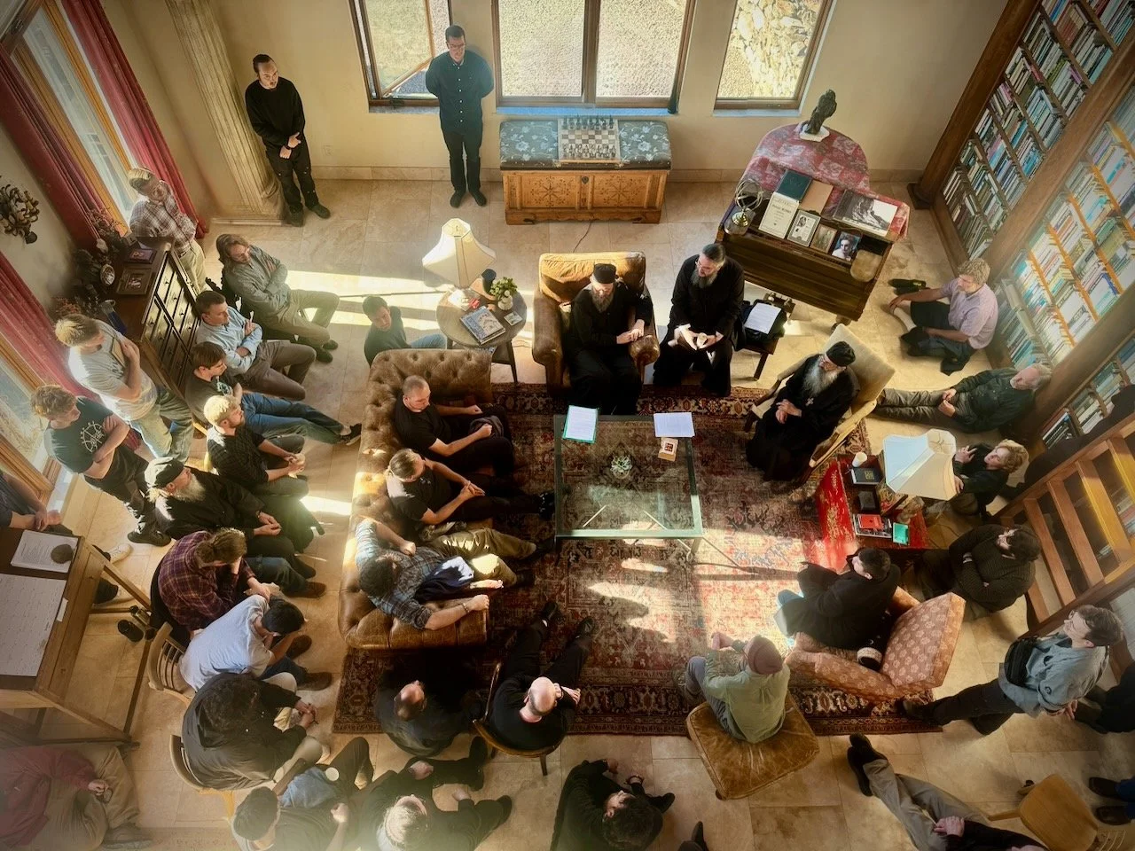 On October 22-24, 2025, the Very Reverend Archimandrite Methodius, the Abbot of the Hilandar Monastery on Mount Athos, Hieromonk Arsenije, and Stefan Milenkovic visited St. Peter’s Monastery and Abbot Ephraim. During their visit, the Iguman met with almost fifty young men from as far away as Canada and Arizona. They listened attentively to his homily and asked great questions during a two-hour Q&A with the two abbots.